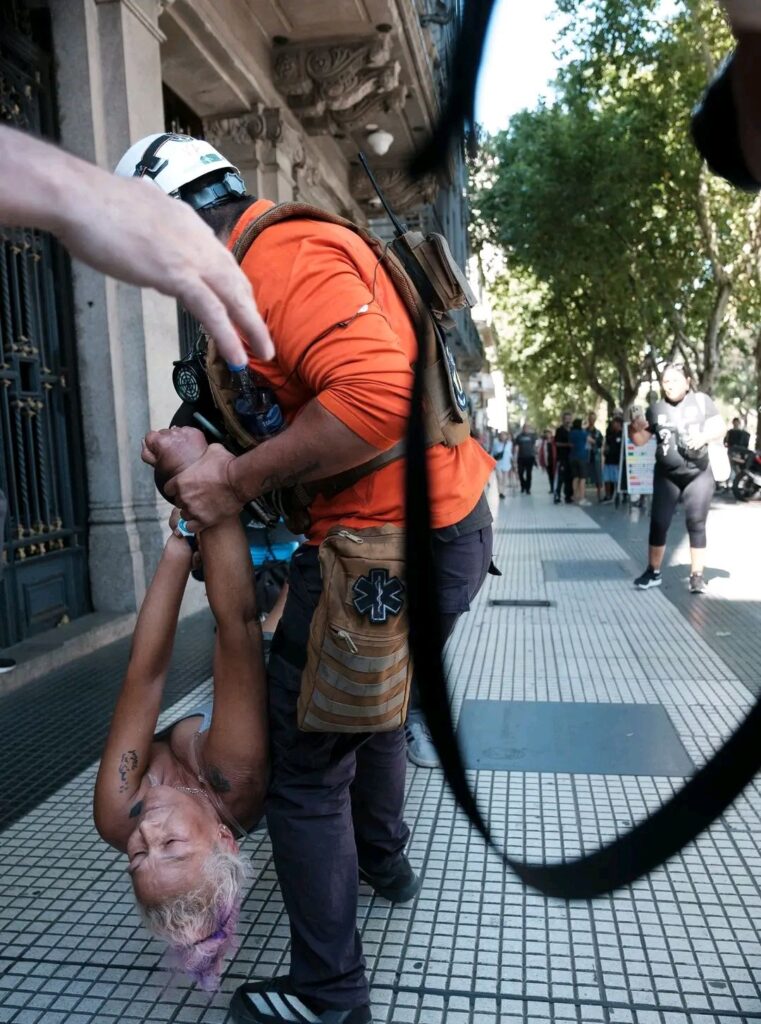 HERIDOS Y DETENIDOS EN BRUTAL REPRESIÓN A JUBILADOS Y DISCAPACITADOS EN EL CONGRESO. Mientras el presidente Javier Milei exponía sus devaneos en Davos, las fuerzas federales de Seguridad y la Policía de la Ciudad formadas en un enorme dispositivo golpearon salvajemente a unos pocos jubilados que se manifestaban como todos los miércoles en el Congreso de la Nación. La señal C5N mostró cómo se inició la represión, con una provocación de un policía de la Ciudad, quien empujó con violencia a una persona que se auxiliaba con dos muletas. El agente se escondió en el edificio de la Auditoría General de la Nación. Cuando los demás jubilados fueron -indignados- a protestar contra esa acción, un batallón de choque de esa misma fuerza empezó la represión. Otras señales de noticias (TN y LN+) trataron de justificar el accionar policial al ubicar el inicio de la represión en un intento de identificación de personas «con actitud sospechosa».